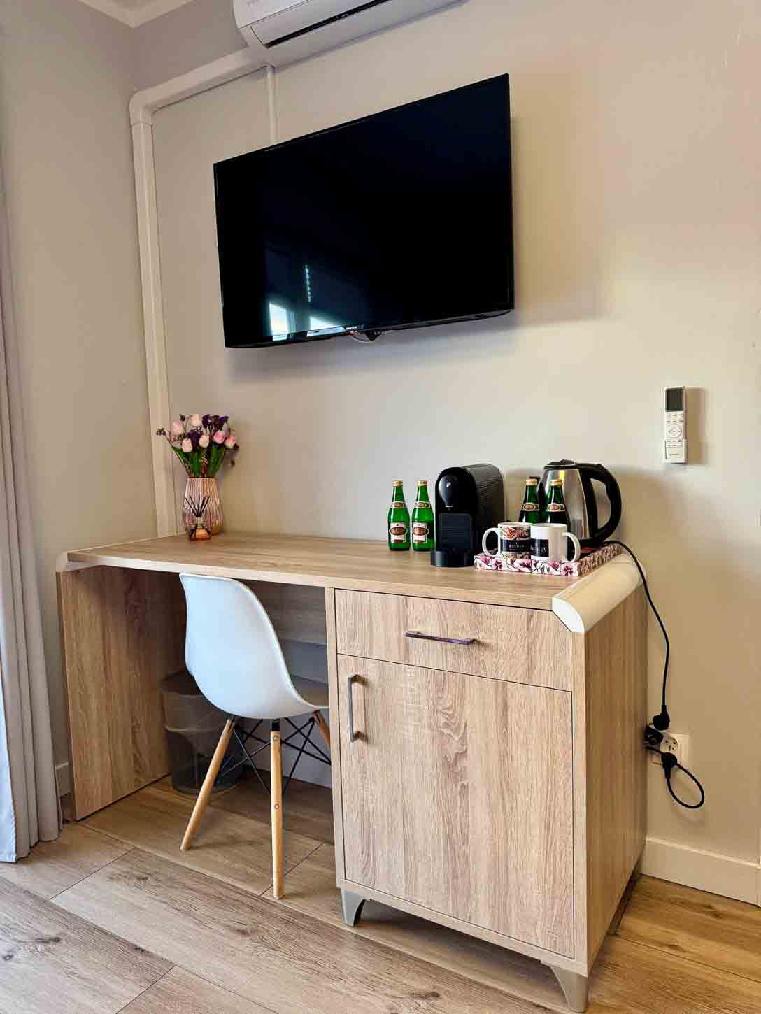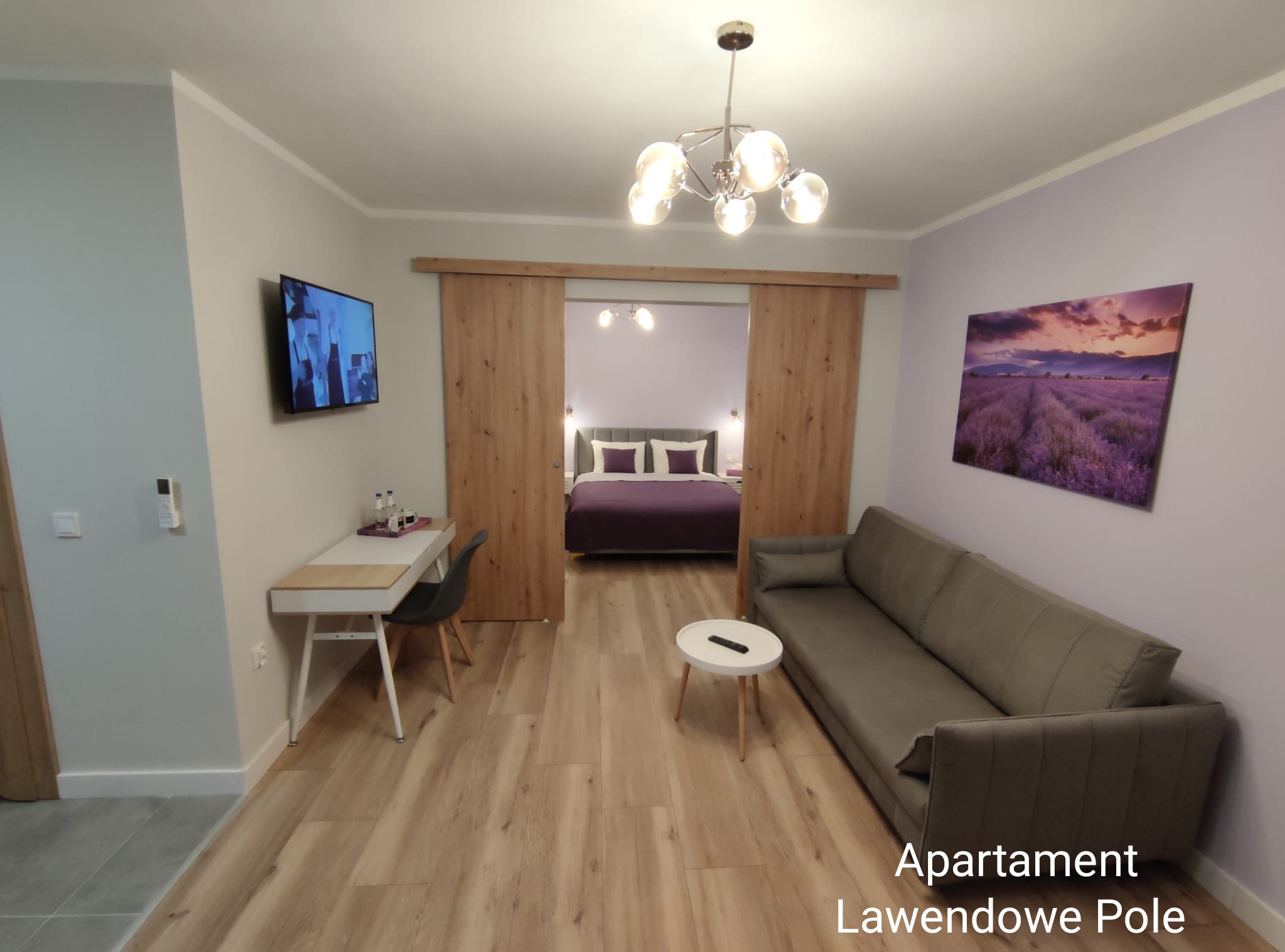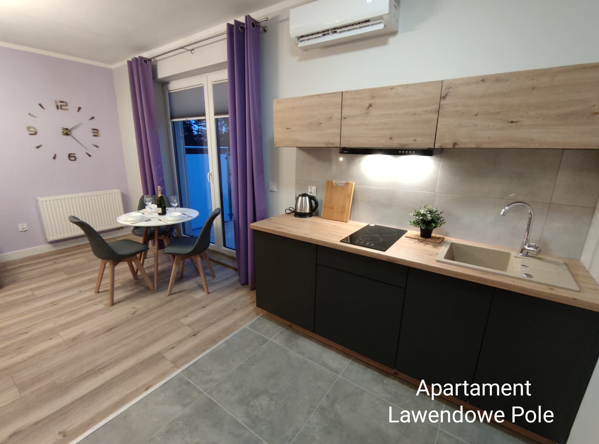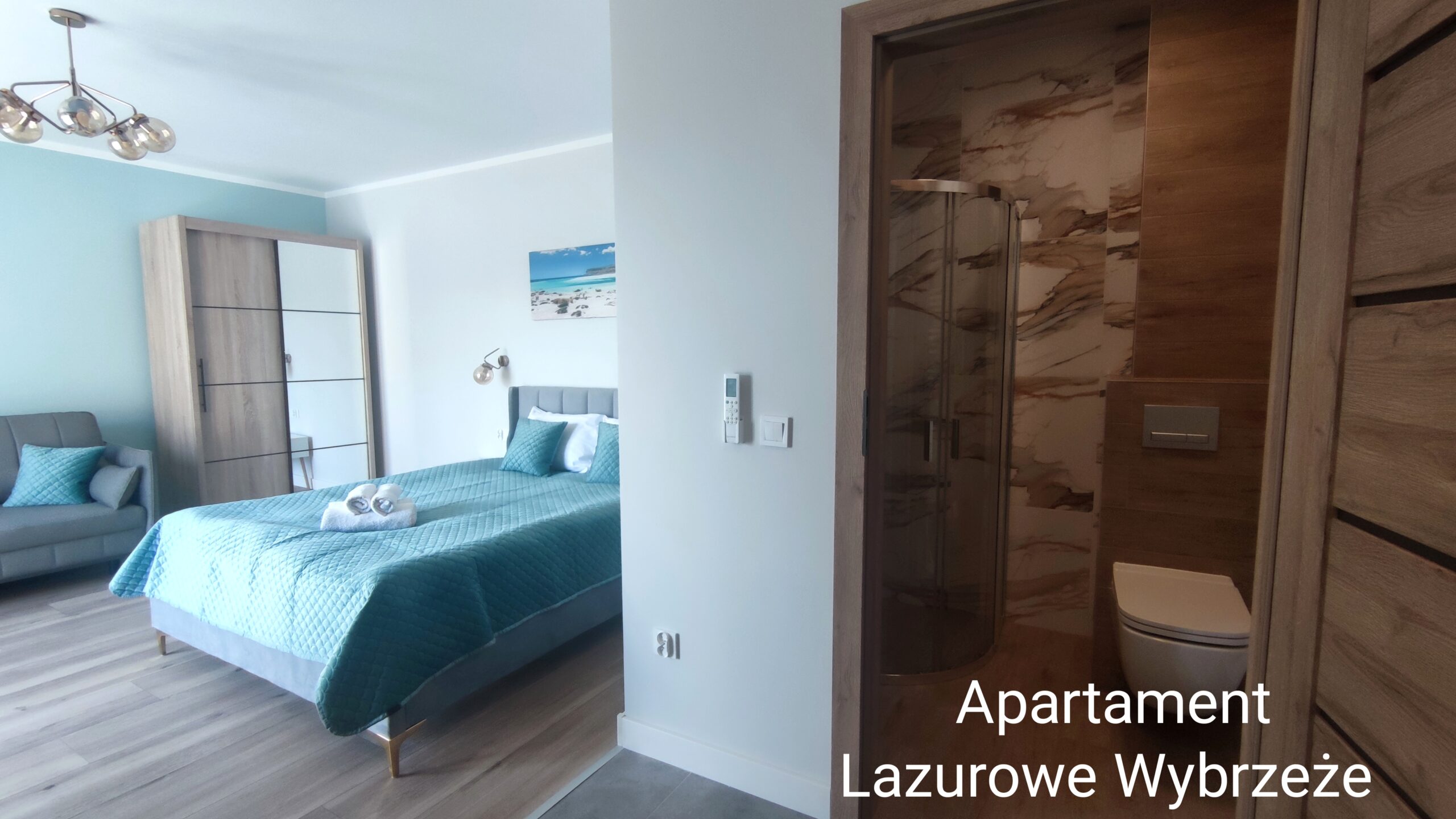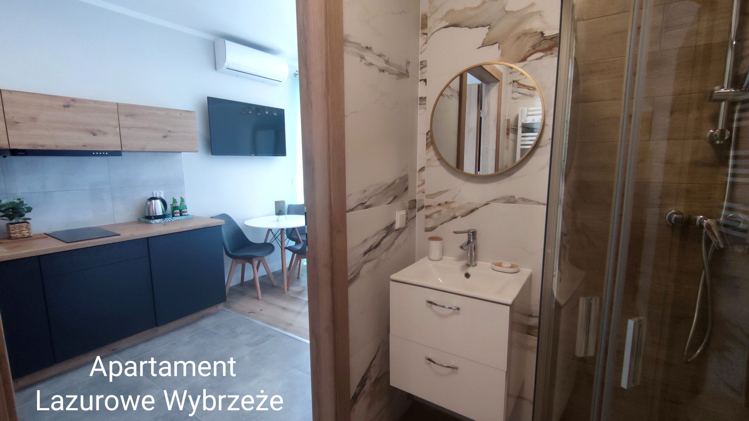 Apartament 30m2 wyposażony w aneks kuchenny i oddzielną sypialnę. Na wyposażeniu znajduje się aneks kuchenny, lodówka, czajnik elektryczny, leżaki i parawan oraz klimatyzacja